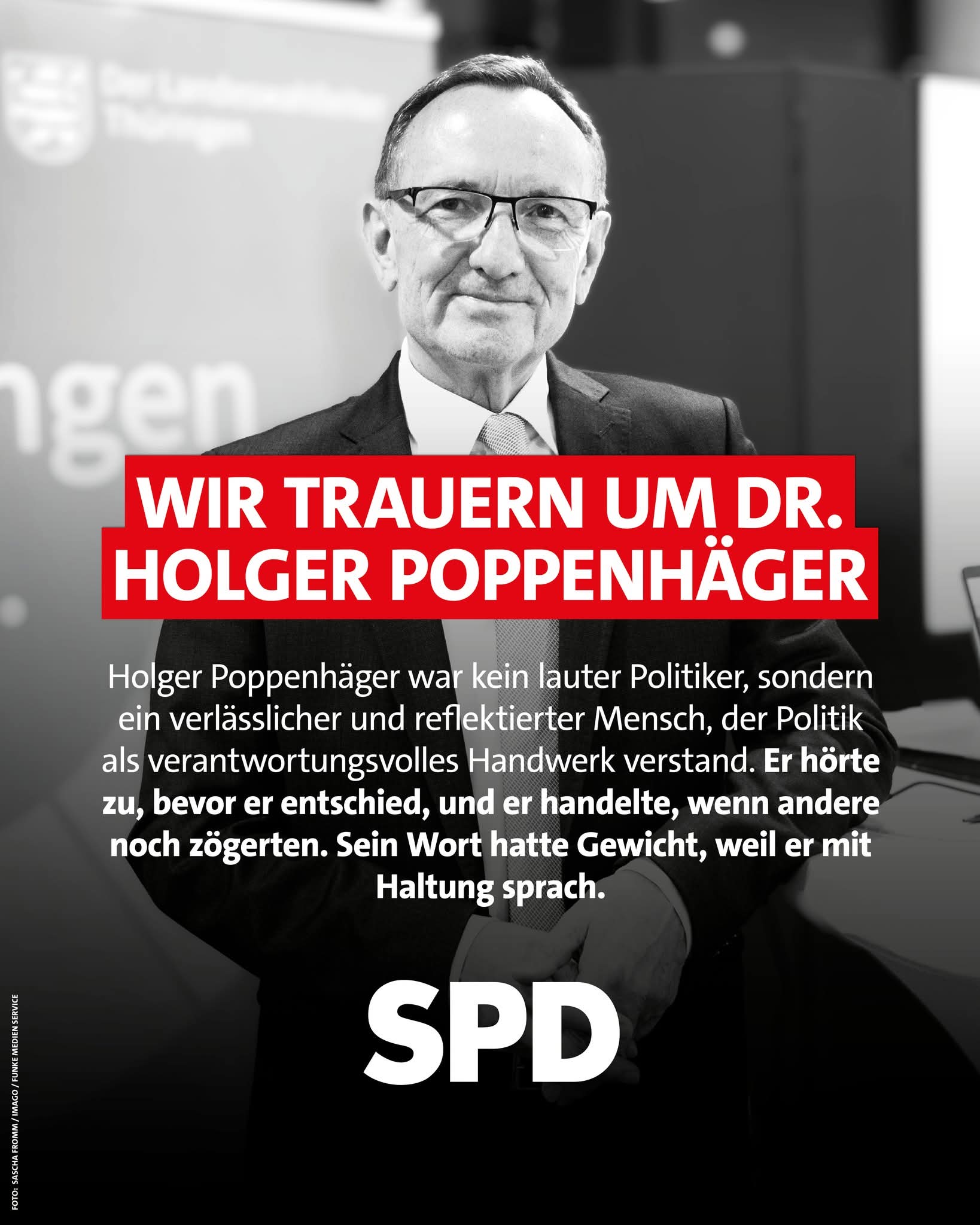 Der SPD-Kreisverband Suhl trauert um Dr. Holger Poppenhäger, der überraschend am 14.10.2025 verstorben ist. Dr. Poppenhäger war Präsident des Thüringer Landesamtes für Statistik, ehemaliger Innen- und Justizminister des Freistaats Thüringen sowie langjähriger Kommunalpolitiker in Erfurt. Sein plötzlicher Tod erfüllt uns mit großer Bestürzung.